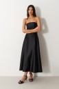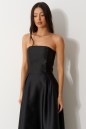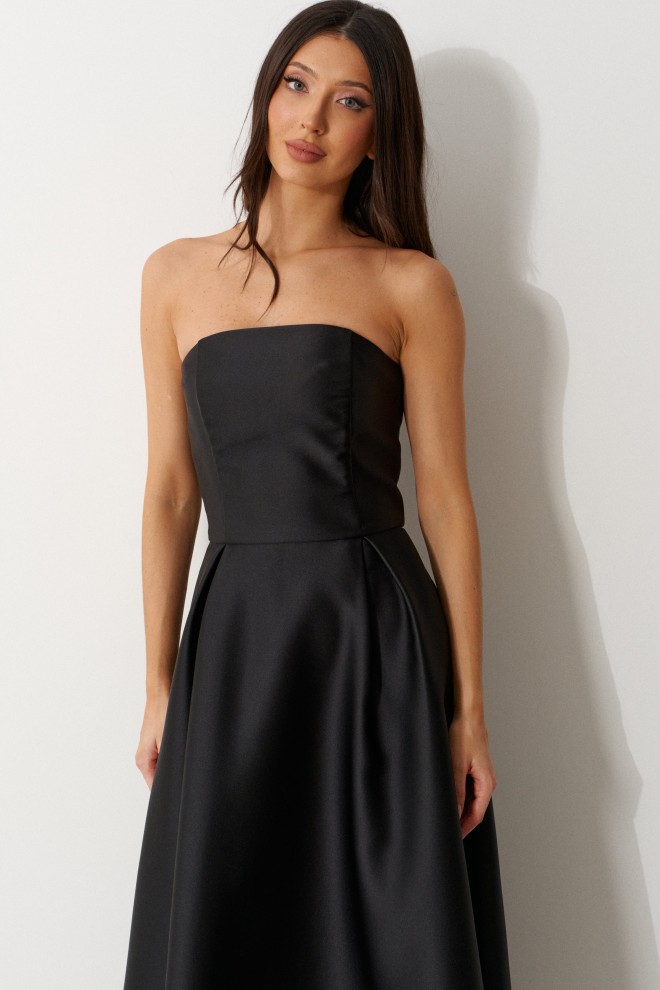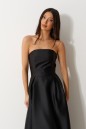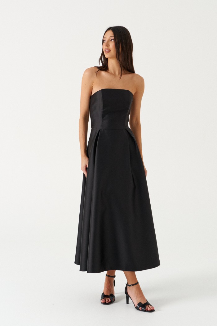 Платье полуприталенное, выполнено из ткани черного цвета с блеском. Характеристики: А-образный силуэт, лиф корсетный, прямой вырез, отрезная, брендированная подкладка, в ценральном шве на спинке потойная молния, по переду и спинке лифа вытачки. Длина изделия по центру спинки 107 см, длина по боковому шву 113см.