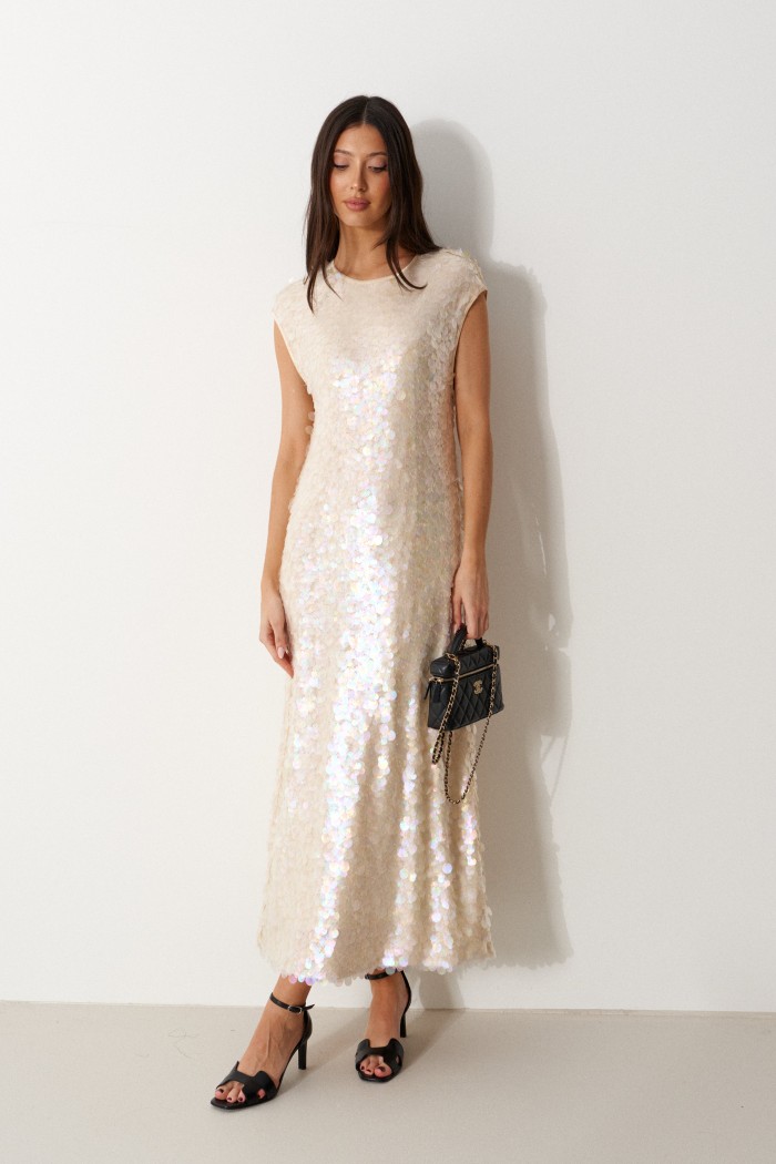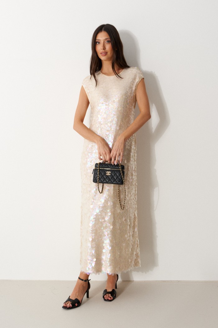 Платье прямого кроя выполнено из полотна с пайетками. Характеристики: на подкладке, без рукавов, вырез горловины круглый, горловина и проймы окантованы эластичной бейкой. Длина изделия 120 см.