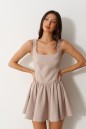 Платье-мини выполнено из трикотажного полотна бежевого цвета. Характеристики: широкие нерегулируемые бретели, низ с фигурным срезом, заканчивающийся воланом, сзади потайная застежка-молния. Длина по центру спинки 64 см, длина по боковому шву 57 см.