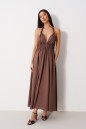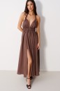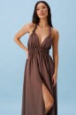 Платье-макси выполнено из текстильного полотна коричневого цвета. Характеристика: двойной лиф, переходит в завязки на спинку, пояс на резинке, юбка свободного кроя, на подкладке, по переду юбки два глубоких разреза (65 см). Длина юбки с учётом пояса 103 см.