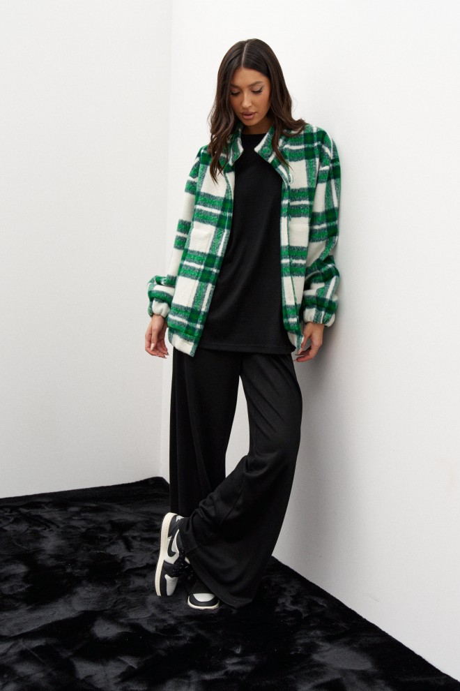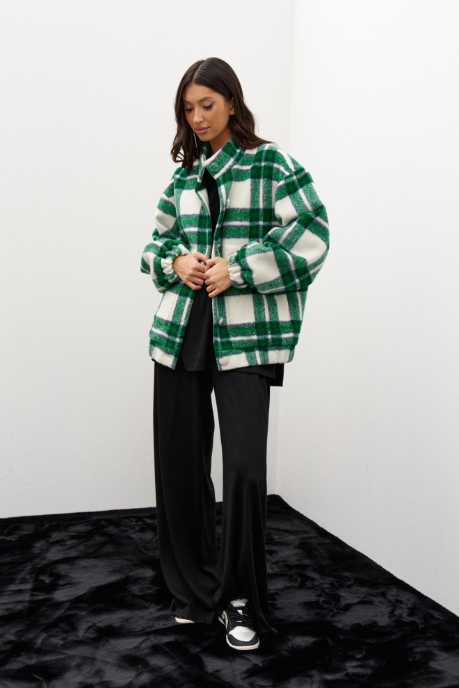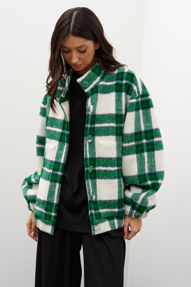 Бомбер выполнен из фактурного зеленого в клетку полотна. Характеристики: воротник-стойка, застёжка центральная на петли пуговицы, пуговицы выполнены из основной ткани изделия, есть подкладка, по переду изделия нашиты карманы, широкий спущеный рукав заканчивается манжетом-резинкой,по низу изделия резинка. Длина по спинке от края горловины 69 см, длина рукава от края горловины 79 см.