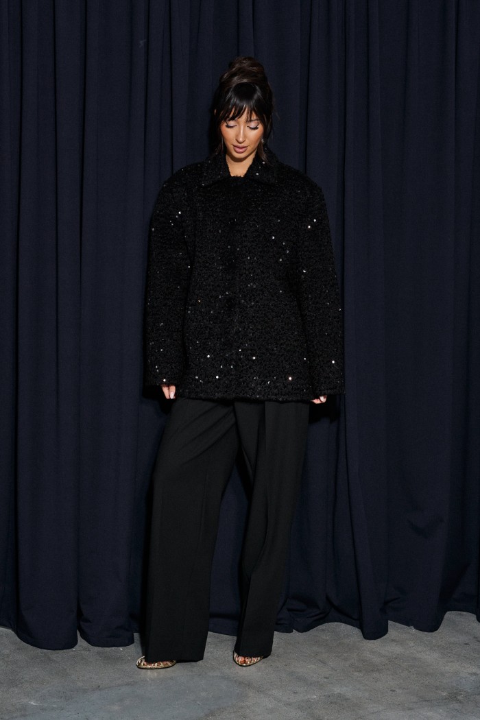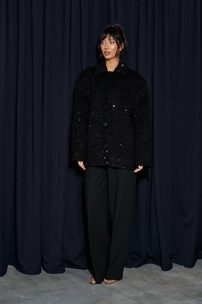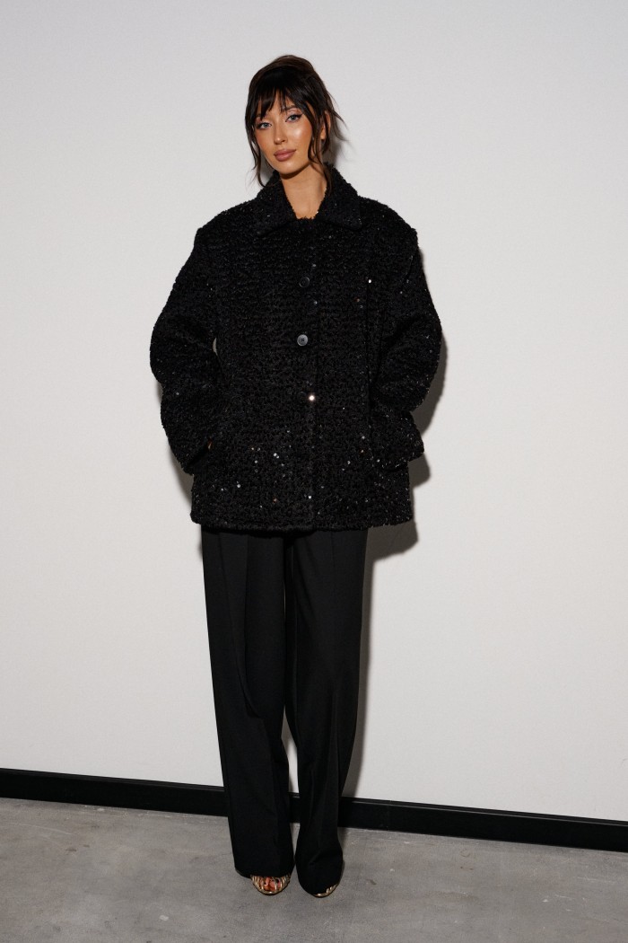 Полупальто прямого свободного кроя, выполнено из из фактурной плотной (пальтовой) ткани чёрного цвета с пайетками. Характеристики: брендированная подкладка, воротник отложной, рукав втачной, немного спущен, застёжка центральная пуговицы. Длина спинки 74 см. Длина рукава от линии втачивания 65 см