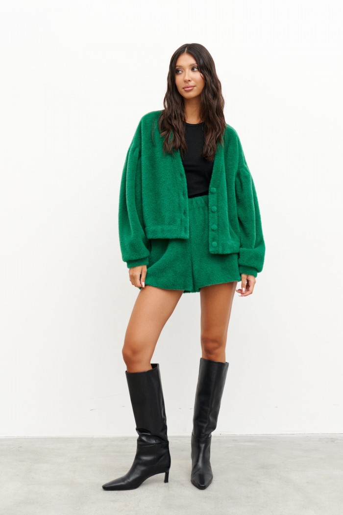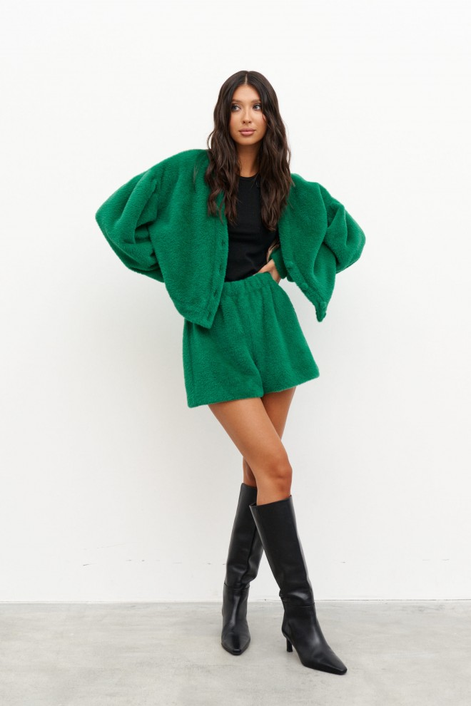 Шорты прямого кроя выполнены из текстурного мягкого полотна зеленого цвета. Характеристики: прямой крой, подкладка, пояс на резинке. Длина по боковому шву 38 см.