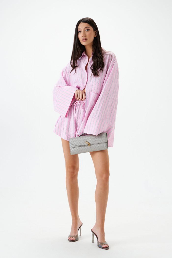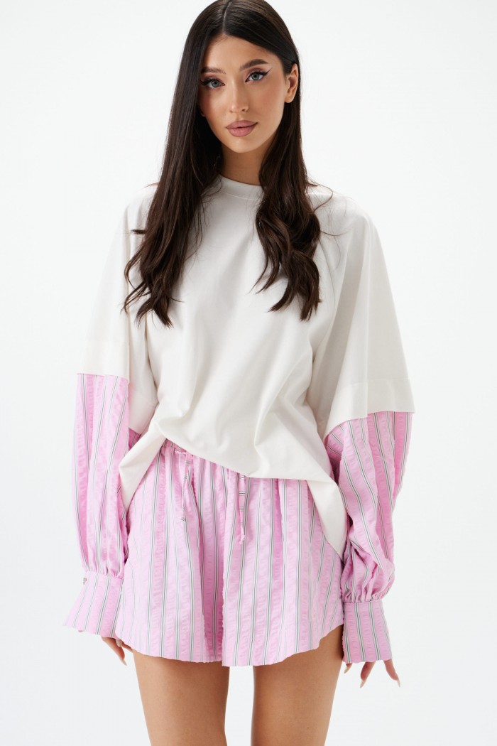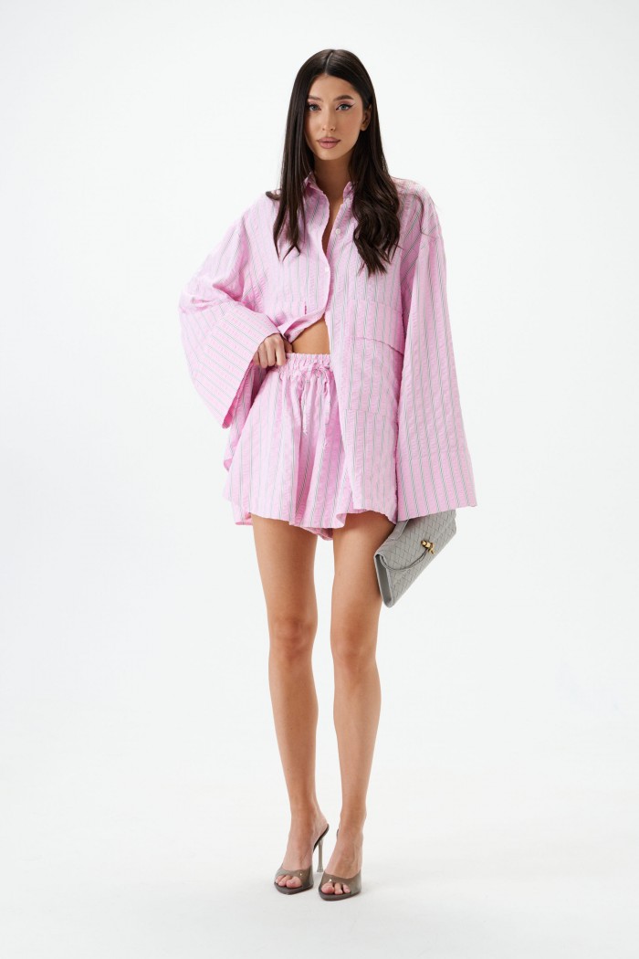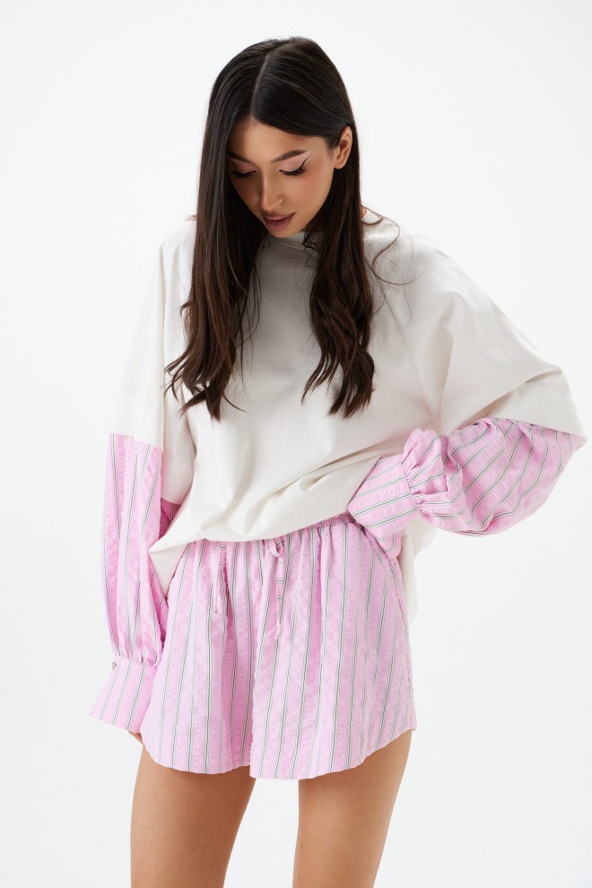 Шорты выполненные из хлопкового полотна. Характеристики: широкие, короткие, пояс притачной, присборен на резинку. Имеет две отделочные строчки по краям, образующие кулису, в которую продет шнур-завязка. В боковых швах карманы с отрезным бочком. Низ обработан в подгибку с закрытым срезом. длина 32 см