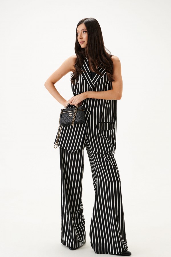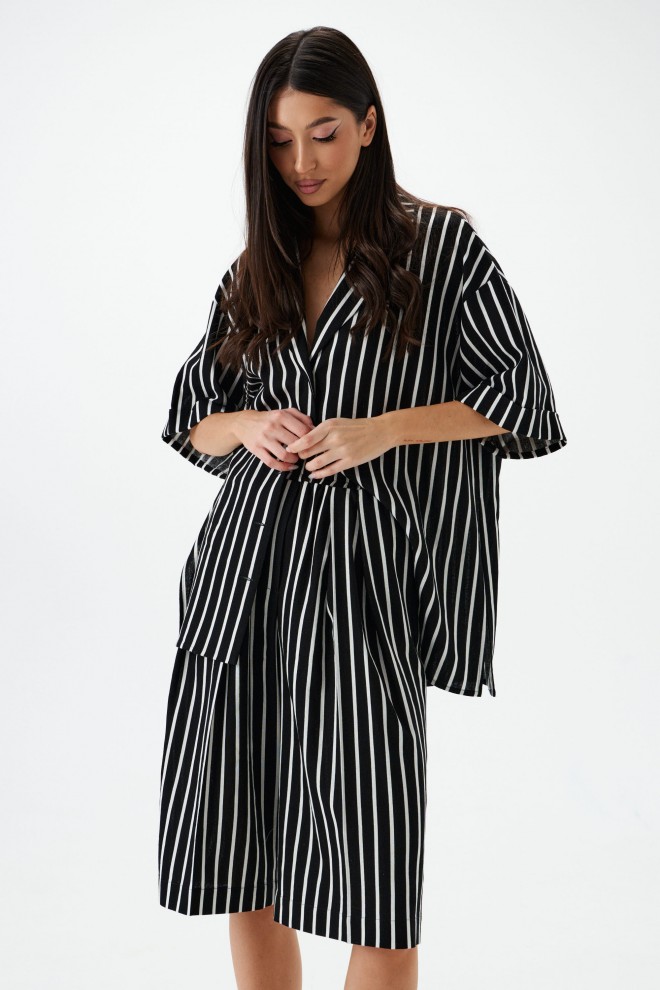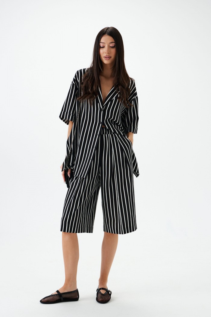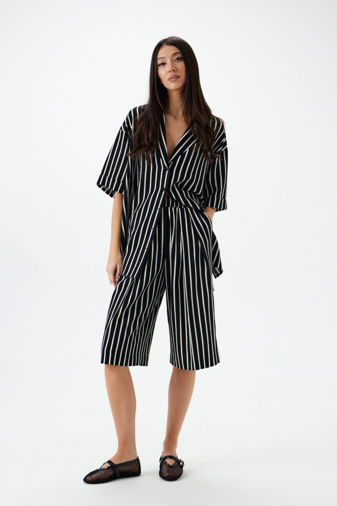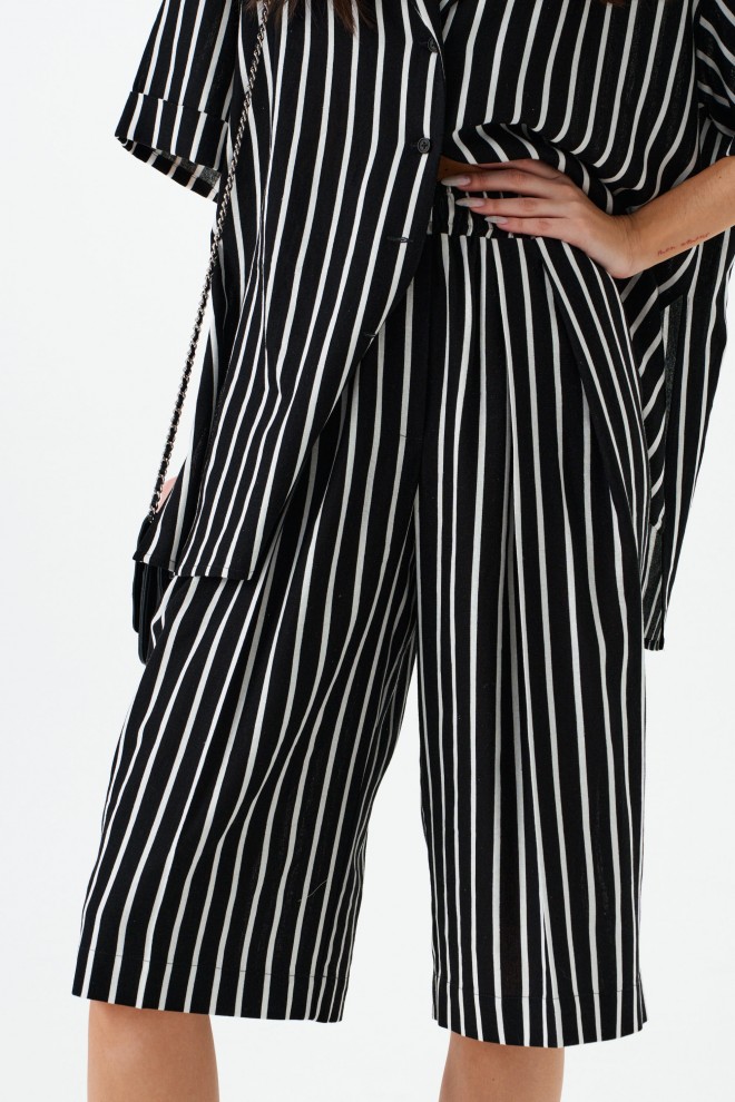 Шорты-бермуды. Выполнены из легкого текстильного полотна черного цвета с принтом вертикальная полоска . Прямой крой. Пояс на резинке. Есть боковые карманы. Заутюженные стрелки на передней части изделия. Длина по боковому шву 63 см