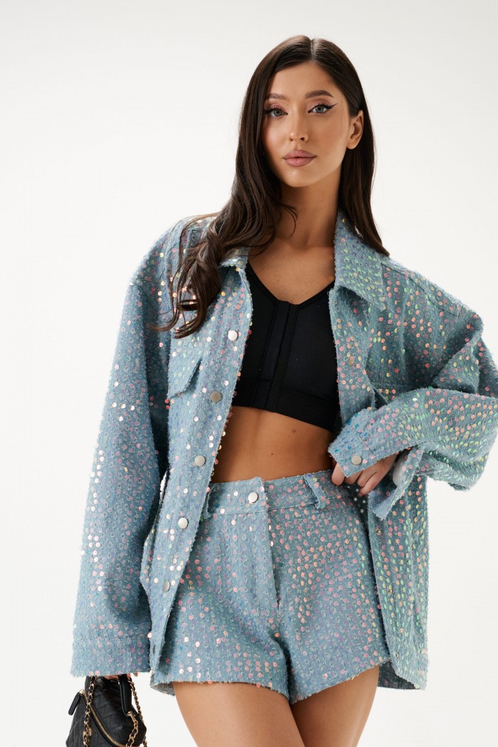 Шорты. Выполнены из джинсовой ткани голубого цвета на люрексной основе с перфорацией и пайетками. Пояс стабильный. Шлёвки. Застёжка центральная пуговицы, молния. По переду фигурные карманы. Задняя часть с кокеткой и накладными карманами.