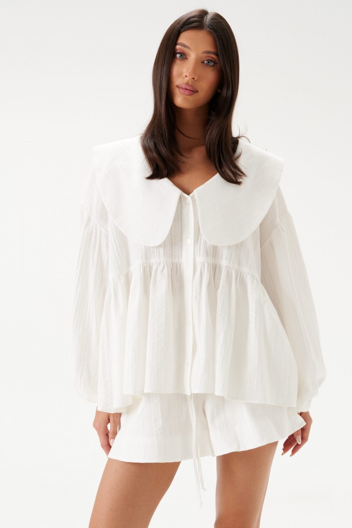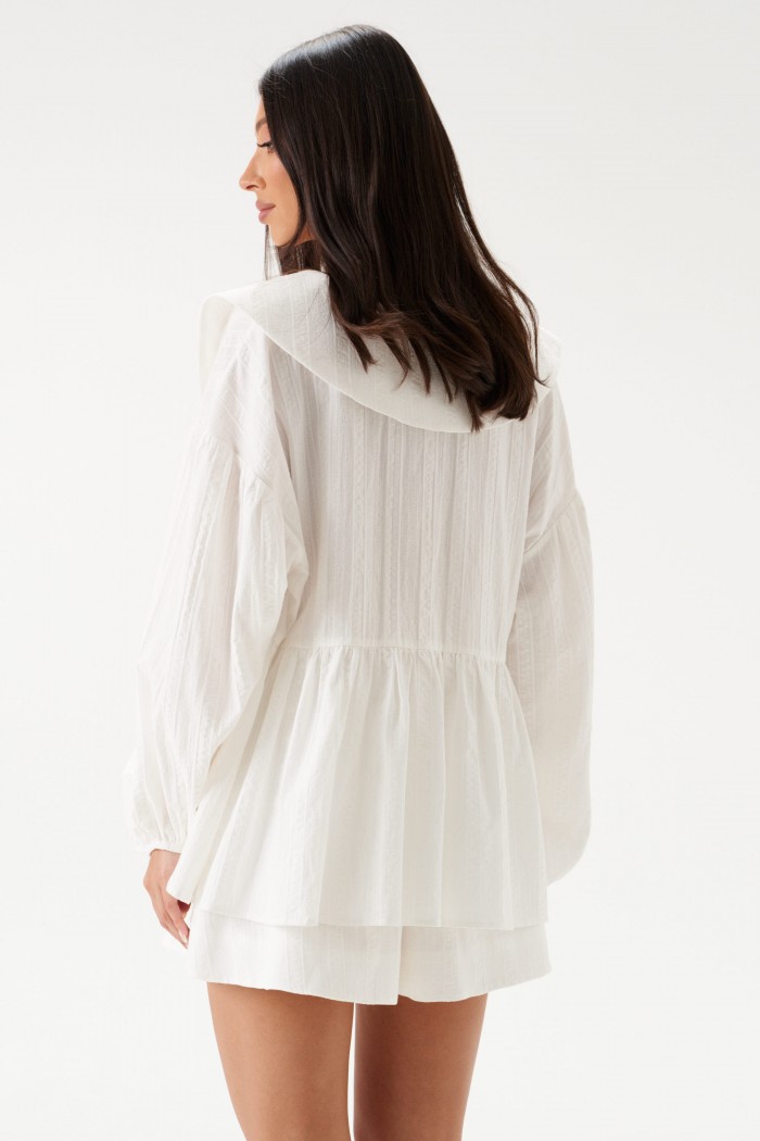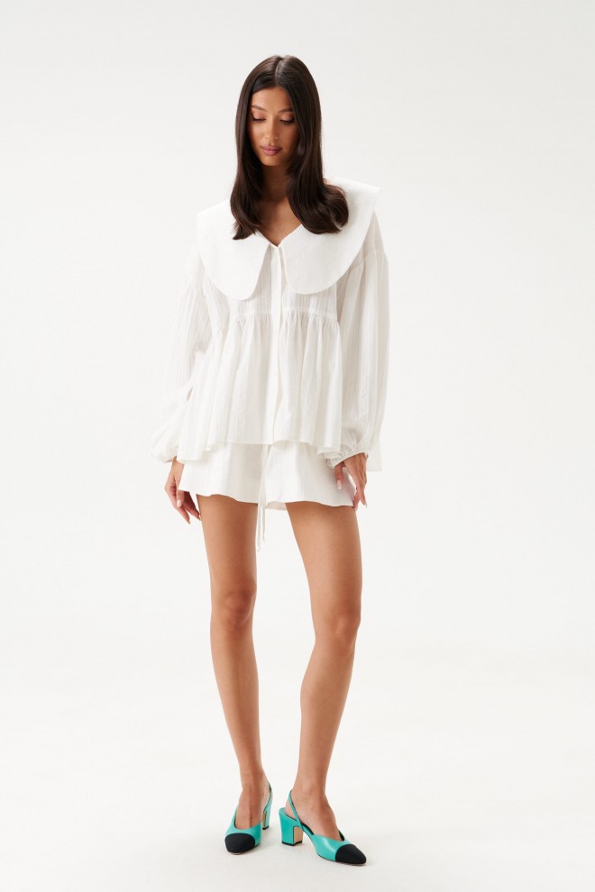 Шорты свободного кроя, из хлопковой ткани белого цвета. Пояс на резинке с завязками, подкладка, в боковых швах корманы. Длина по боковому шву 39см.