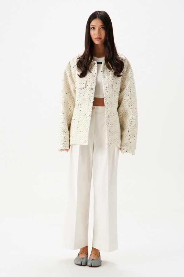 Шорты широкого свободного кроя, выполнены из джинсовой ткани белого цвета на люрексной основе с перфорацией и пайетками. Пояс на резинке, подкладка. Имеет две отделочные строчки по краям, в боковых швах потайные карманы. Длина 40 см