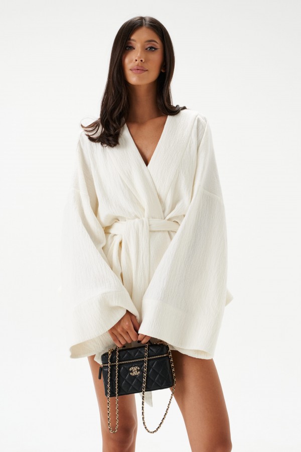 Шорты свободного кроя. Выполнены из хлопкового полотна белого цвета – муслин. Без подкладки. Пояс на резинке. В боковых швах карманы с отрезным бочком. По передней и задней частям вертикальные швы. По переду имитация застёжки. В боковых швах по низу разрезы (3 см). Длина по боковому шву 30 см. Шорты дополнит кардиган А2208