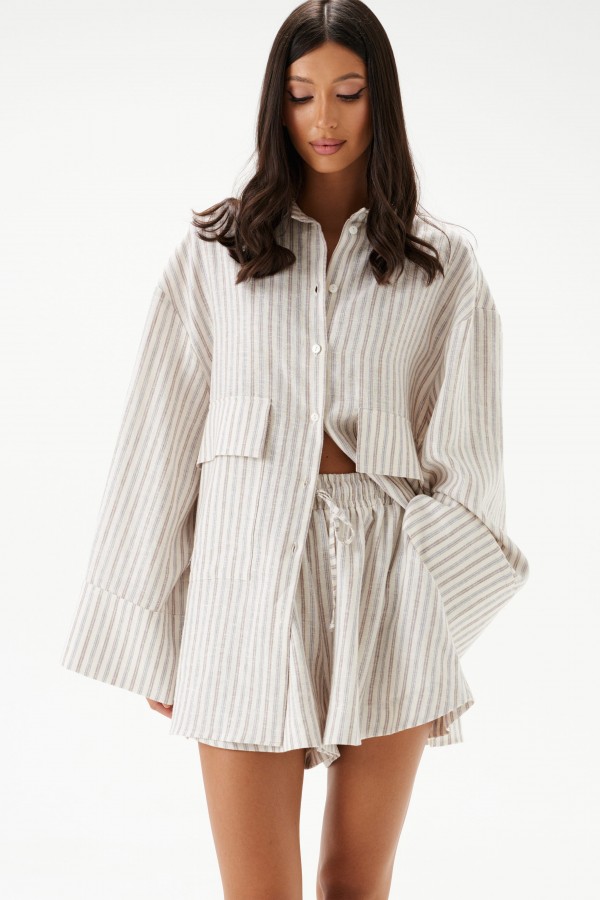 Шорты выполненные из льняного полотна. Характеристики: широкие, короткие, пояс притачной на резинке, кулиска. В боковых швах карманы с отрезным бочком. Низ обработан в подгибку с закрытым срезом. Длина по боковому шву 34 см