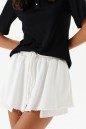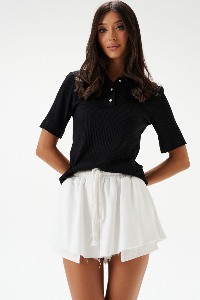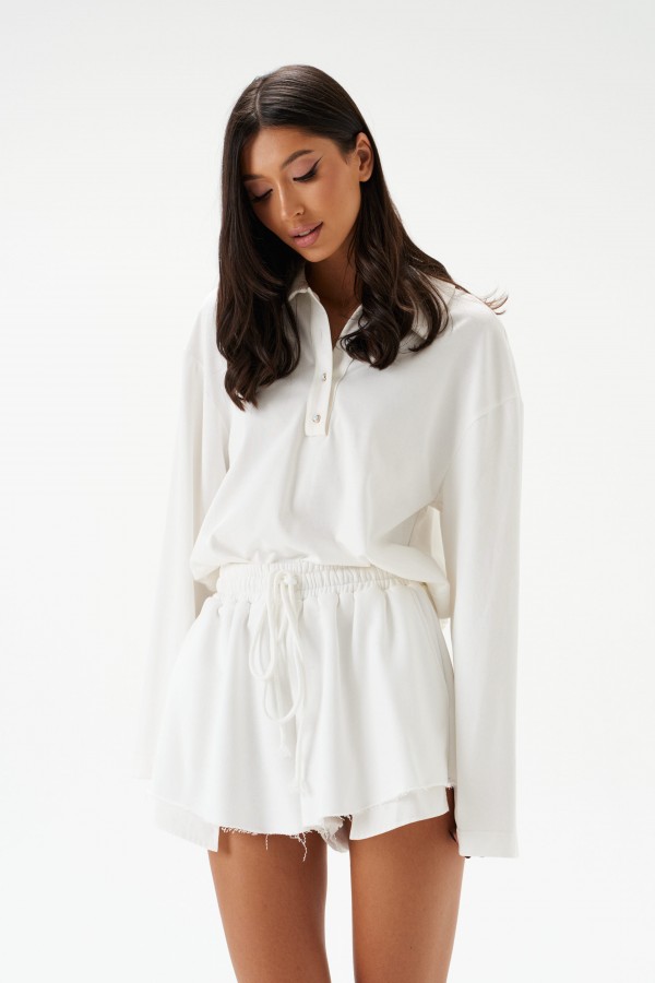 Шорты свободного кроя, выполнены из трехнитки белого цвета. Характеристики: укороченные, пояс на резинке приточной, кулирка. В боковых швах удлиненные карманы, выделяющиеся по низу шорт. Низ шорт прострочен, края не обработанны. Длина по боковому шву 30см