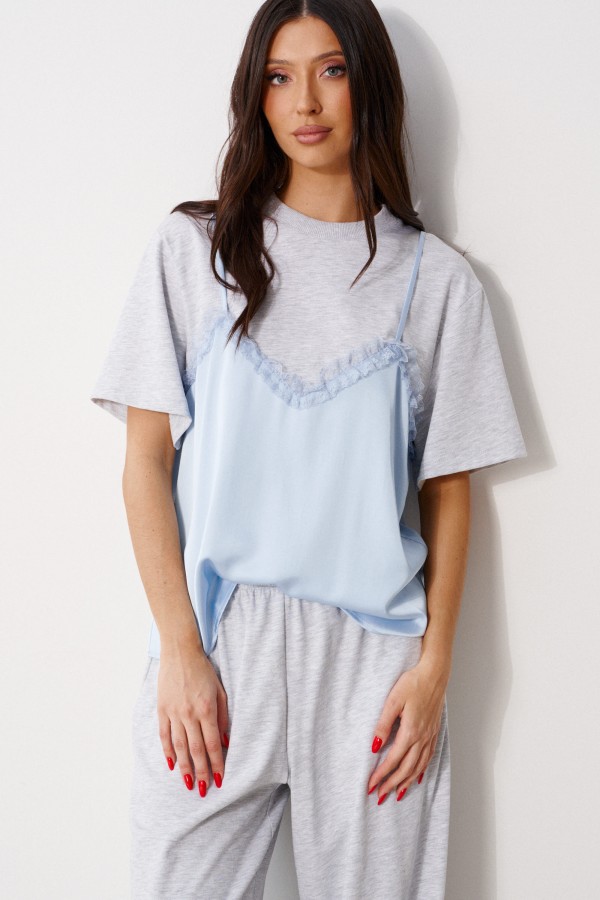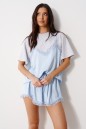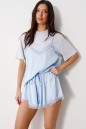 Шорты свободного кроя выполнены из струящейся ткани нежно-голубого цвета.