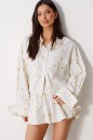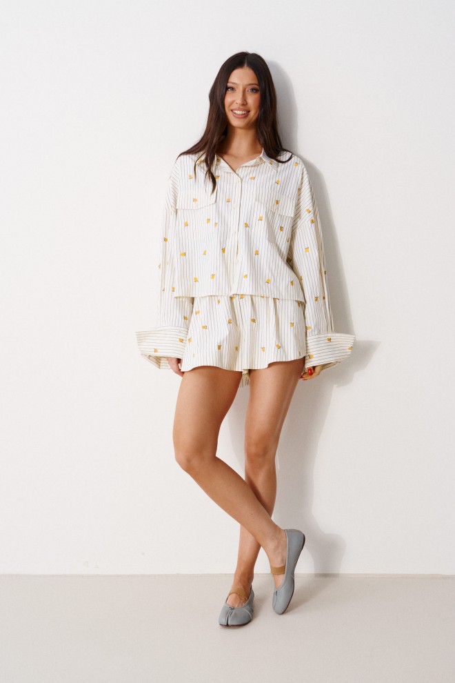 Шорты свободного кроя. Выполнены из хлопковой (смесовой) ткани цвета "пломбир" в полоску с вышивкой лимоны. Пояс на резинке. Застёжки нет. Карманы с отрезным бочком в боковых швах. Длина с учётом пояса 34 см