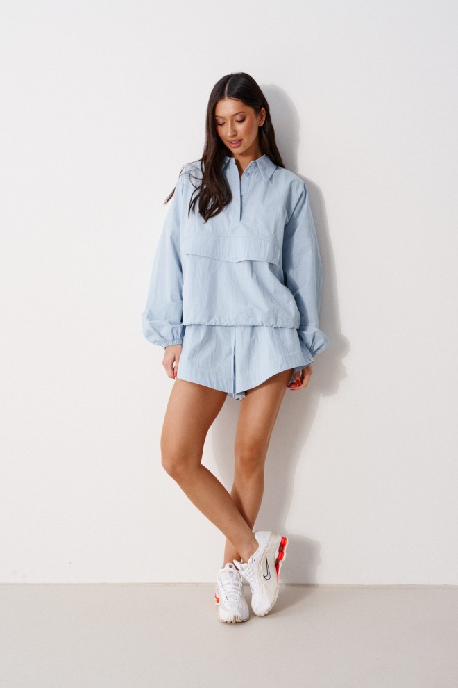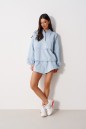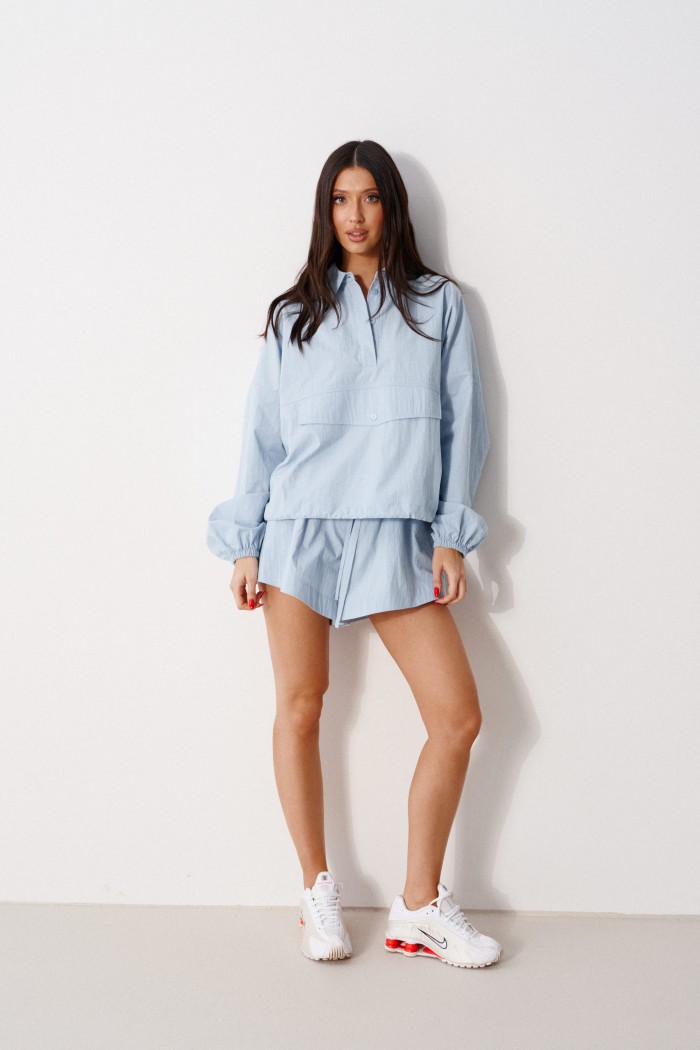 Шорты свободного кроя, выполнены из плотного небесно-голубого полотна. Характеристики: широкие, короткие, пояс притачной на резинке, кулиска. В боковых швах карманы с отрезным бочком. По низу внешнего шва небольшой разрез 3 см. Длина по боковому шву 34 см