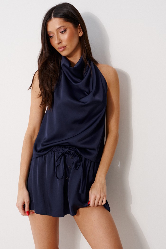 Шорты свободного кроя, выполнены из струящейся ткани. Характеристики: свободный крой, пояс на резинке с кулиской, иммитация гульфика с пуговками. Длина по боковому шву 33 см.