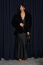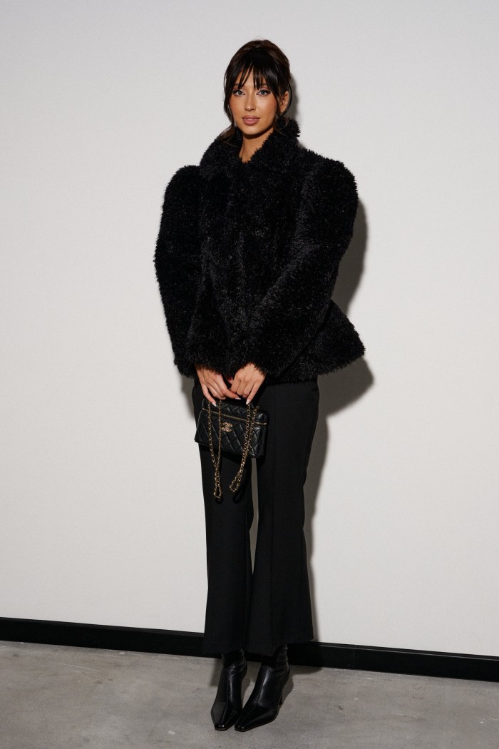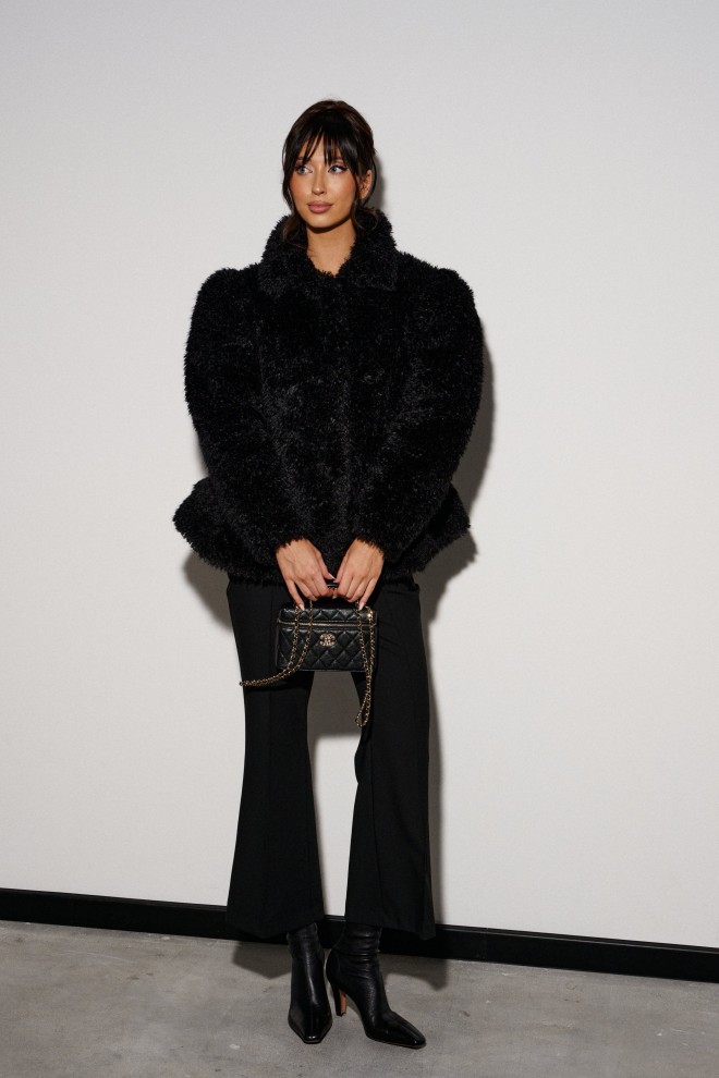 Шубка приталенного силуэта, выполнена из полотна с длинным черным ворсом. Характеристика: прилаталенный силуэт, расклешенный низ. Воротник стойка, рукав втачной, застежка центарльная на потойные крючки. В боковых швах карманы. Подкладка с утеплением. Длина по спинке от края горловины 63см, длина рукава 64см.