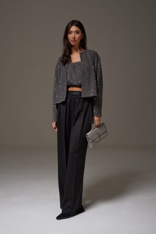 Топ прилегающего силуэта, выполнен из мягкой пушистой ткани серого цвета с пайетками. Верх и низ изделия на резинке. Длина топа 22см.