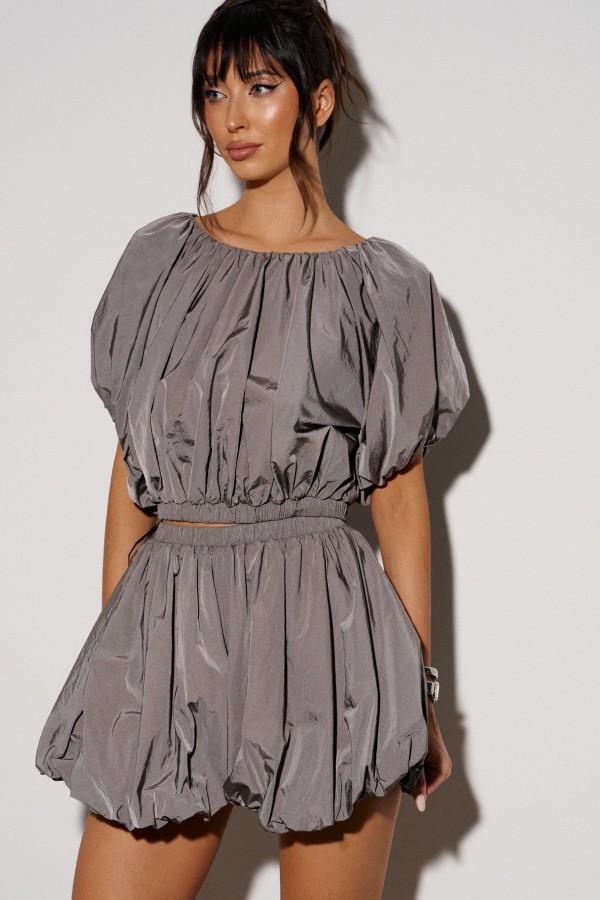 Блузон балон, выполнен из ткани плащевки на брендированной подкладе. Характеристика: блузон выполнен в форме балона, овальная горловина, низ изделия на резинке, на спинке центральный шов, сверху застежка на пелю-пуговицу, рукав-буф на резинке. Длина рукава от кря горловины 33см, длина изделия по центру спинки 43см.