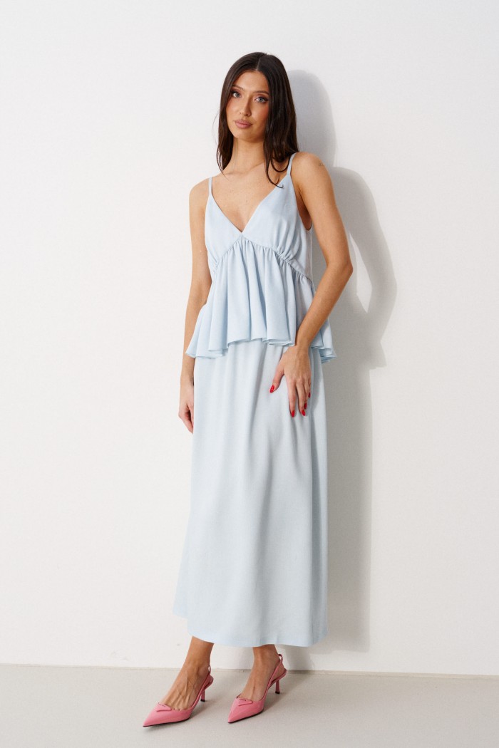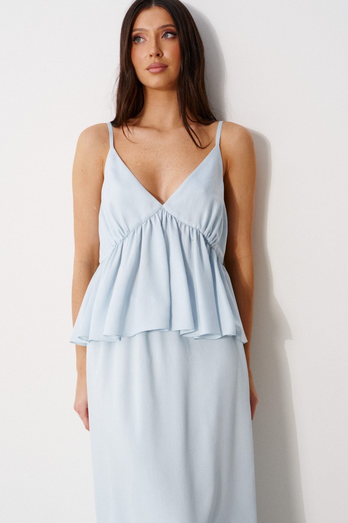 Топ свободного кроя с акцентным лифом, выполнен из мягкой струящейся ткани голубого цвета. Характеристика: V-образный вырез декольте, на регулируемых бретелях, лиф двойной, с фигурным отрезом, спинка закрытая. Длина по боковому шву (с учётом лифа) 33 см.
