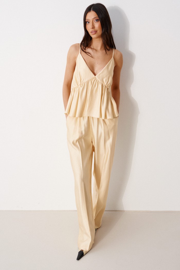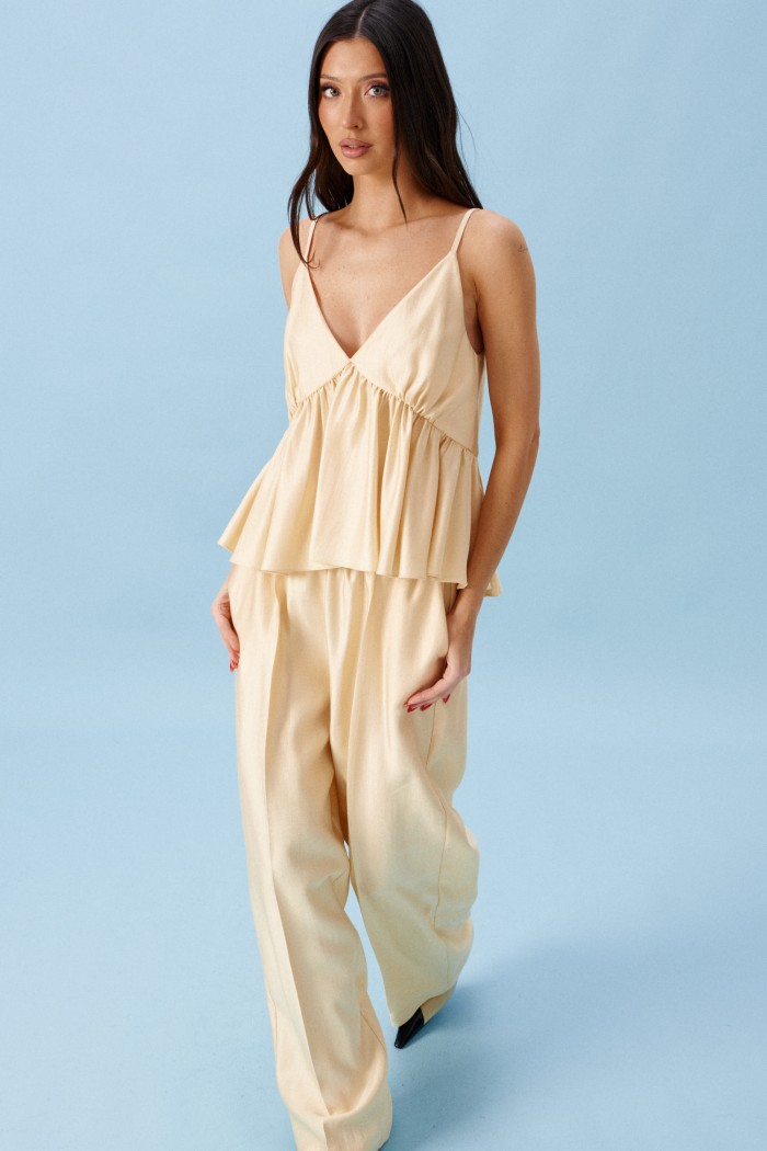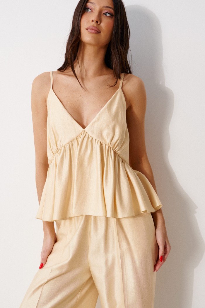 Топ свободного кроя с акцентным лифом, выполнен из мягкой струящейся ткани. Характеристика: V-образный вырез декольте, на регулируемых бретелях, лиф двойной, с фигурным отрезом, спинка закрытая. Длина по боковому шву (с учётом лифа) 33 см.