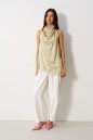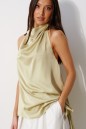 Блузон свободного ассиметричного кроя. Выполнен из струящейся ткани сетлого оливкого цвета. Горловина-качель, застегивается сзади на петли пуговицы. Верхняя часть спинки на резинке. Топ без рукавов. По длинному боковому шву снизу разрез (20 см). Длина по короткому боковому шву 40 см, длина по длинному боковому шву 53 см.