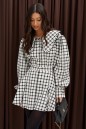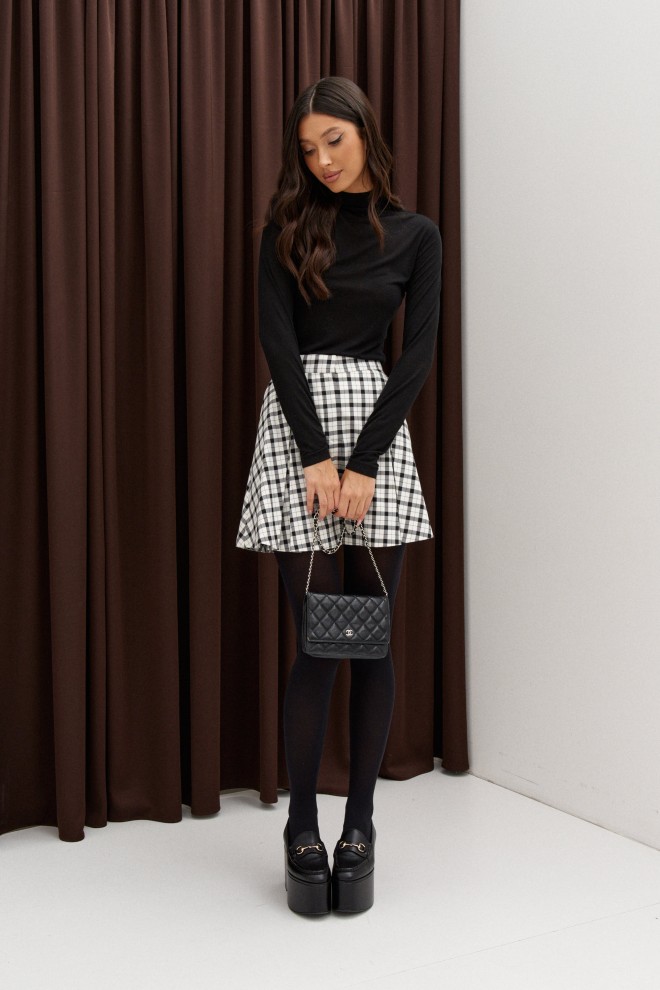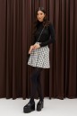 Юбка трапеция выполнена из полотна с черно-белым принтом. Харектеристики: силуэт трапеция, пояс стабильный с шлевками, скрытая застежка на молнии и крючках, декоративные складки, в боковых швах карманы. Длина 42 см.