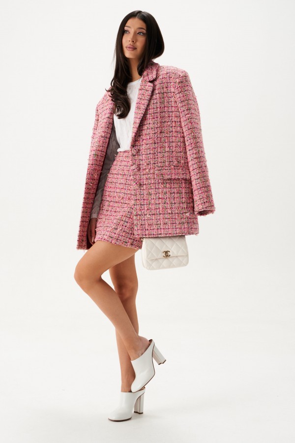 Юбка-мини. Выполнена из твида с пайетками. А-образный силуэт (трапеция). Пояс стабильный, линия талии на обтачке. Есть подклад. Застежка потайная тесьма молния в среднем шве заднего полотна. Длина по боковому шву 44 см