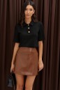 Юбка полуприлегающего силуэта выполнена из искусственной кожи, коричневого цвета. Характеристики: полуприлегающий силуэт, модель расширенна к низу, на подкладке. В среднем шве заднего полотна юбки обработана потайная застежка молния. Пояс юбки обработан обтачкой. Длина изделия 39 см.