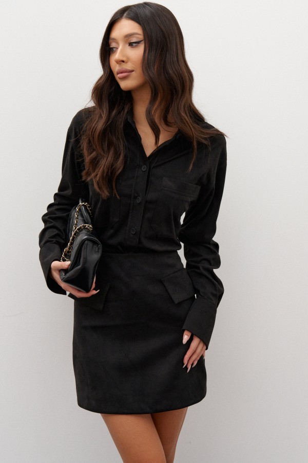Юбка выполнена из мягкой ткани черного цвета (искусственная замша). Характеристики: полуприлегающий А-образный силуэт, подкладка, застежка - потайная тесьма молния в среднем шве заднего полотна, по переду имитация карманов с клапаном. Длина по поковому шву 43 см.