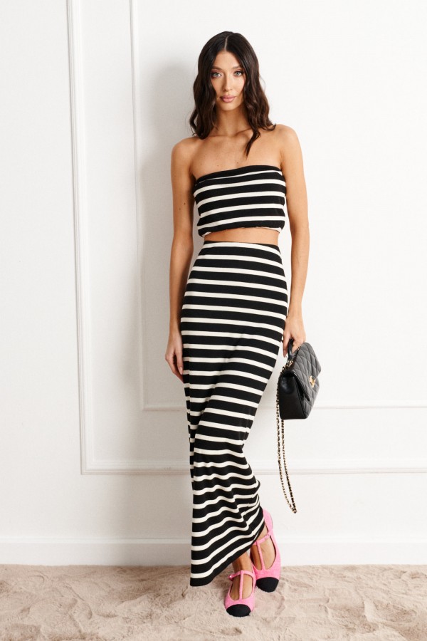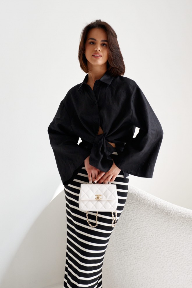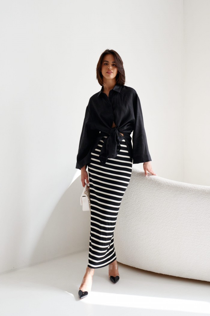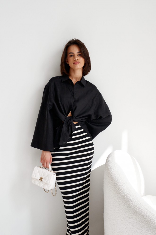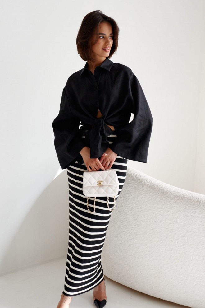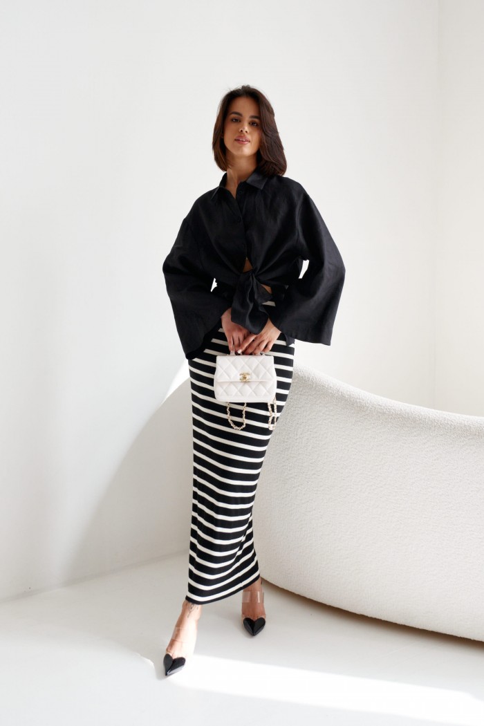 Юбка прилегающего силуэта выполнена из трикотажного полотна с контрастным принтом бело - черные полоски.
