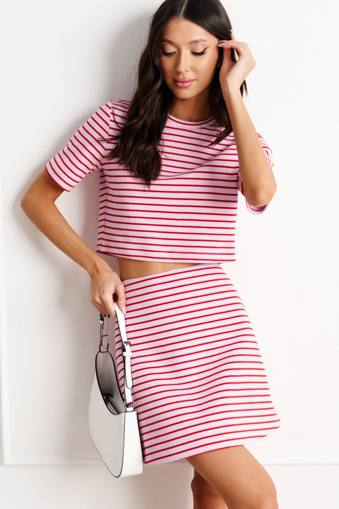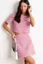 Юбка полуприлегающего силуэта выполнена из трикотажного полотна розового цвета с контрастными горизонтальными красными линиями.