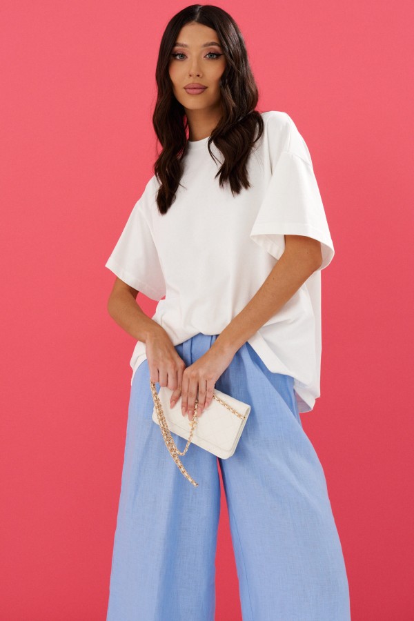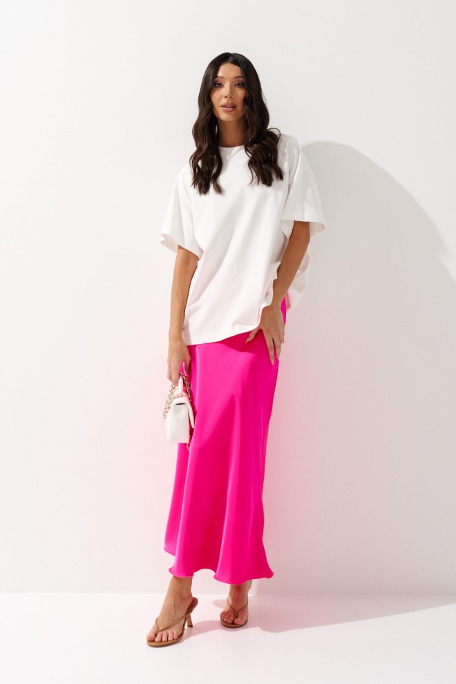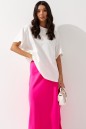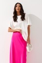 Юбка полуприлегающего силуэта выполнена из струящейся ткани ярко-розового цвета.