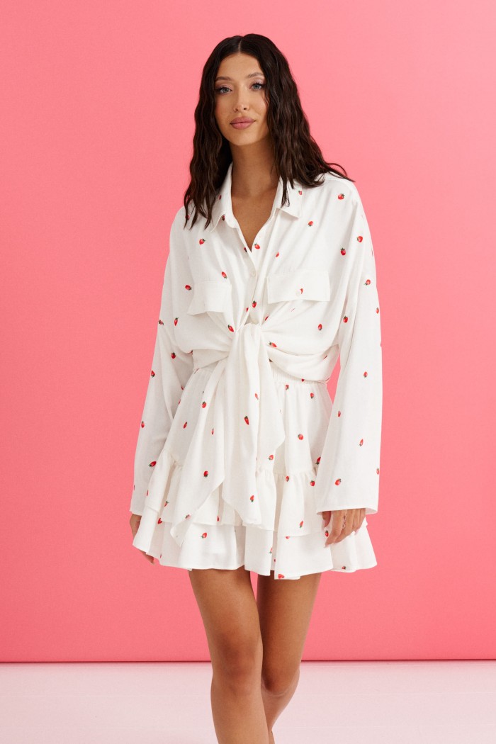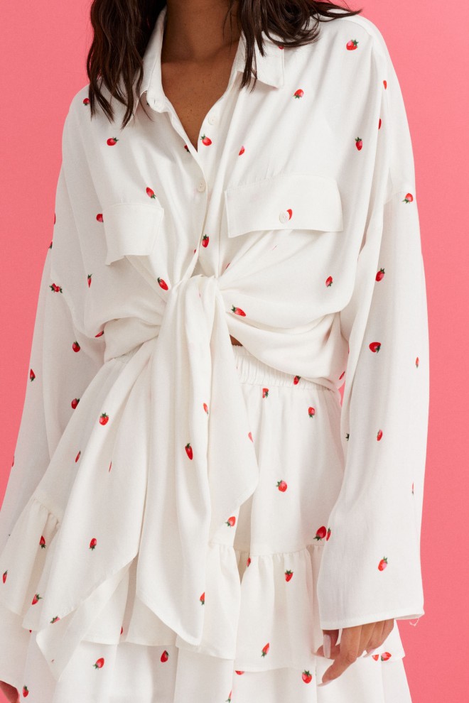 Юбка полуприлегающего силуэта выполнена из белой ткани с ягодным принтом.