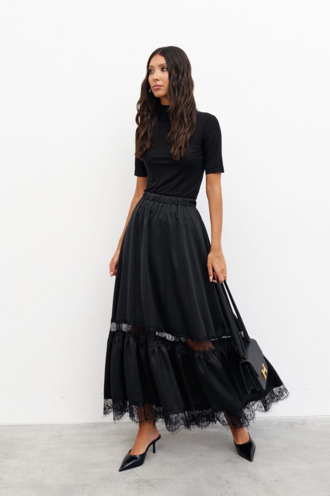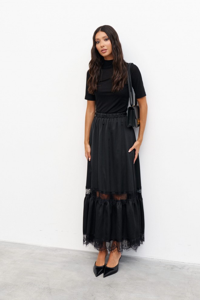 Юбка свободного кроя с акцентным черным кружевом выполнена из струящегося полотна. Характеристики: свободный крой, пояс на резинке, по юбке вставка из ажурного кружева, по низу изделия нашито ажурное кружево. Длина 101 см.