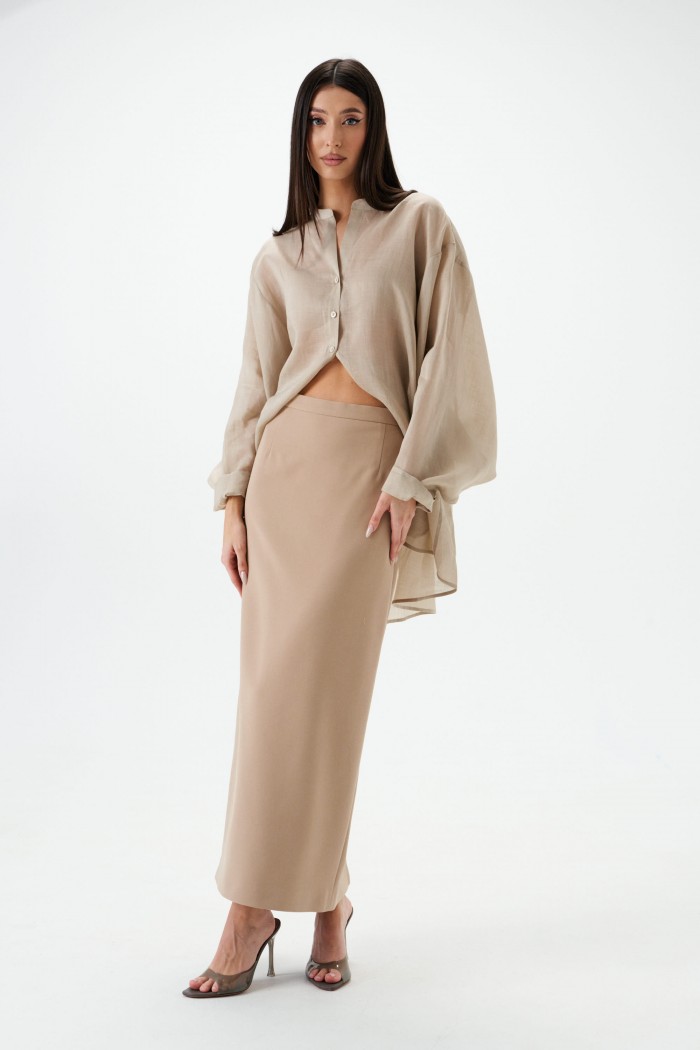 Классическая юбка полуприлегающего силуэта с разрезом выполнена из костюмной ткани песочного цвета. Универсальная модель юбки длины миди для создания образов в разных стилях, образ в офис, на вечер, на встречу. Характеристики: полуприлегающий силуэт, подкладка, пояс стабильный, застёжка потайная тесьма молния, в среднем шве заднего полотна изделия разрез (50 см). Длина изделия 97 см.