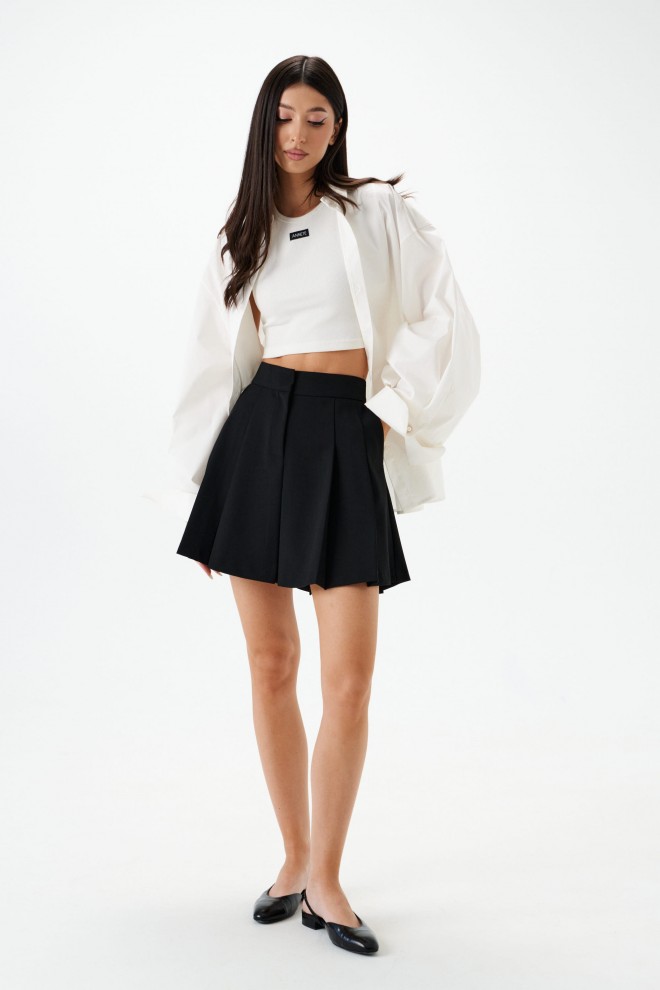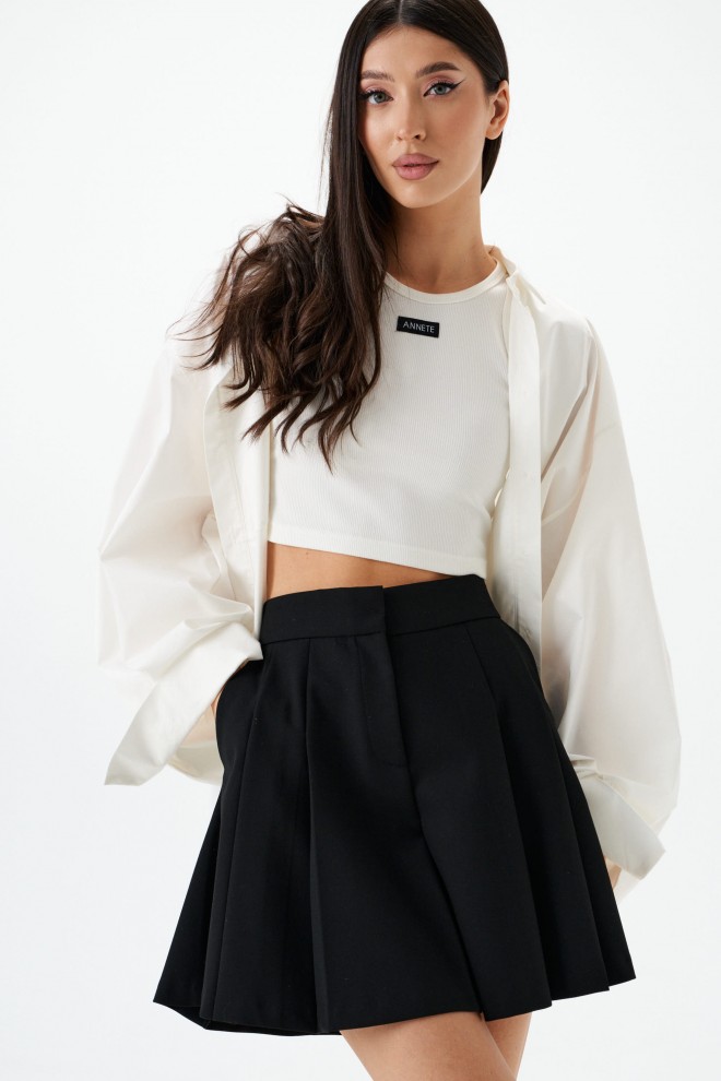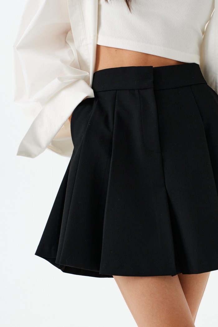 Юбка трапеция выполнена из полотна черного цвета. Харектеристики: силуэт трапеция, пояс стабильный с шлевками, заскрытая застежка на молнии и крючках, складки, в боковых швах карманы. Длина 41 см.