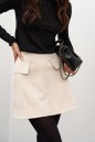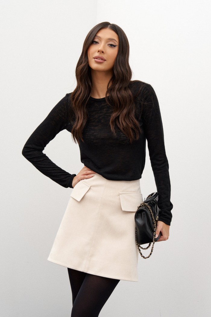 Юбка-мини. Выполнена из эко-замши. Силуэт трапеция. Пояс на обтачке, стабильный. По передней части клапаны - имитация карманов. Переднее полотно разрезное с отделочными строчками. Застежка потайная тесьма молния в среднем шве заднего полотна изделия. Есть подклад. Длина по боковому шву 43 см