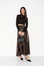 Юбка свободного кроя выполнена из струящейся ткани с леопардовым принтом. Характеристики: свободный крой, подкладка, пояс на резинке со сборкой. Длина 105 см.