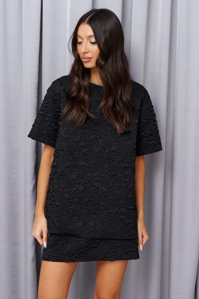 Мини юбка полуприлегающего силуэта выполнена из фактурного полотна черного цвета. Характеристики: полуприлегающий силуэт, подкладка, эластичный пояс. Длина изделия 39 см.
