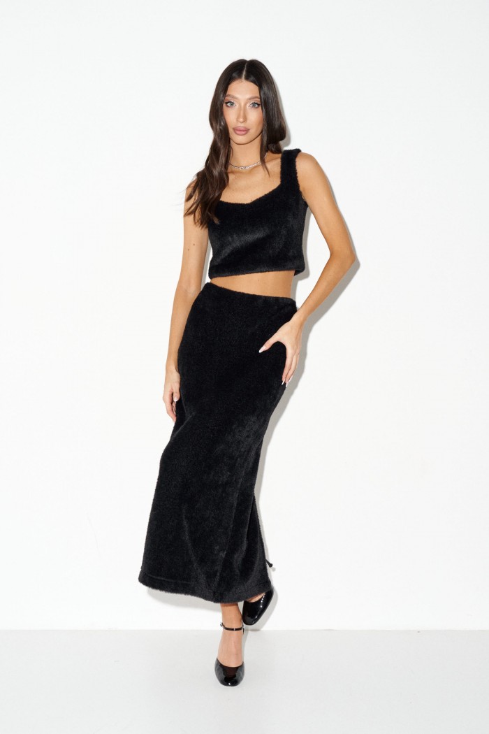 Юбка прямого кроя выполнена из мягкого фактурного полотна. По задней части изделия разрез 48см. Характеристики: прямой крой, подкладка, пояс на резинке. Длина 85 см.