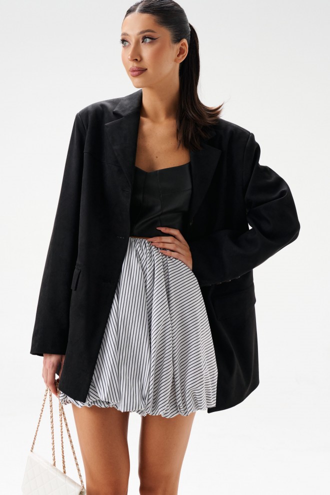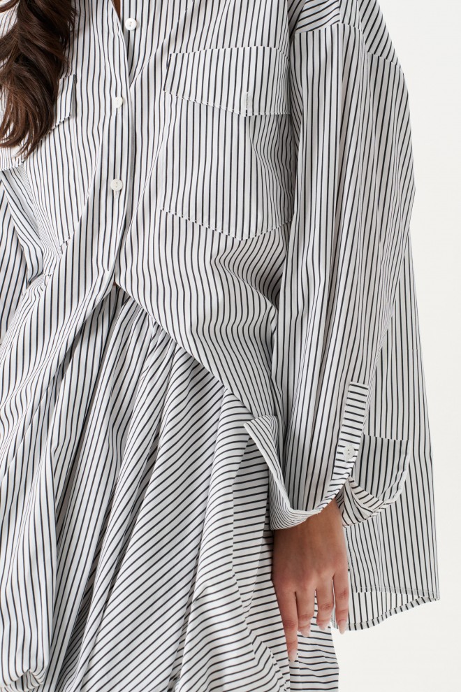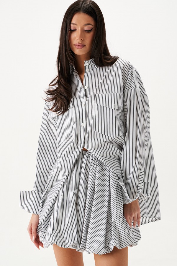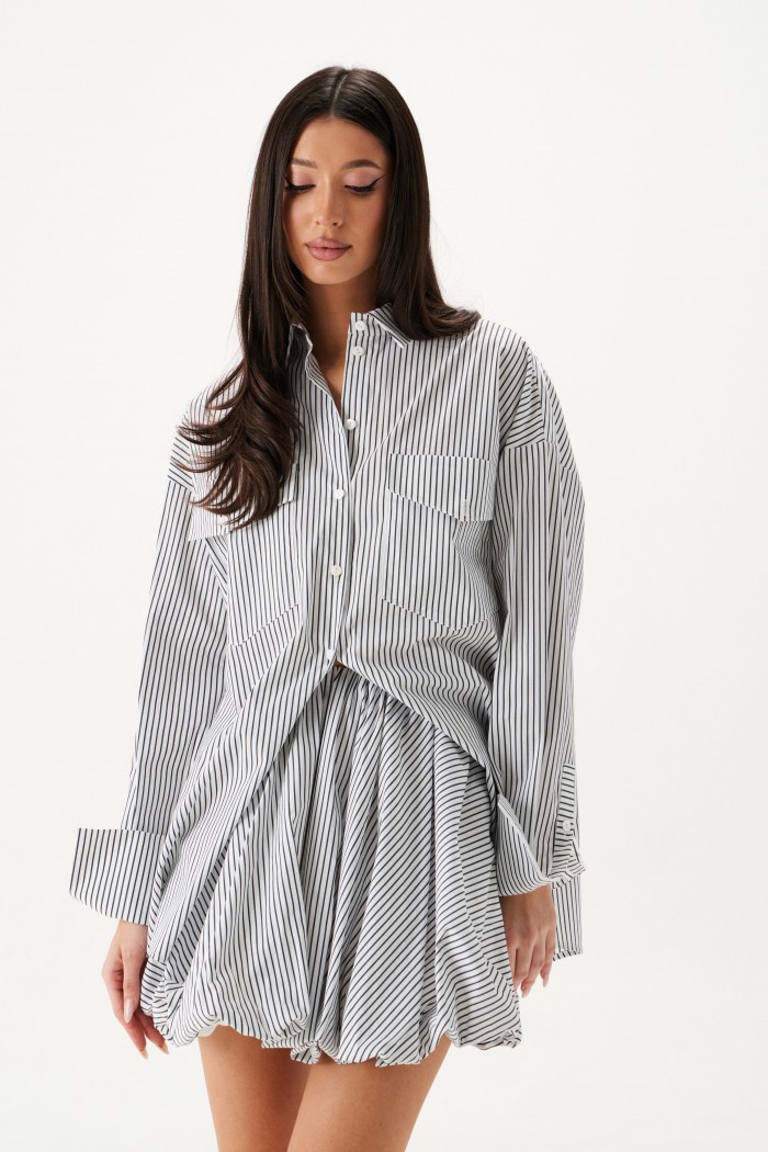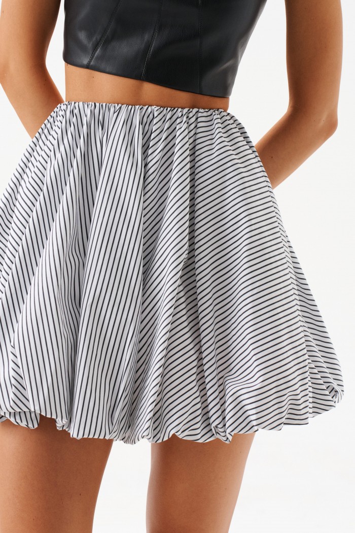 Юбка-баллон в длине мини. Выполнена из хлопкового полотна белого цвета в чёрную полоску. Пояс на резинке. Есть подкладка. Застёжки нет Длина 41 см