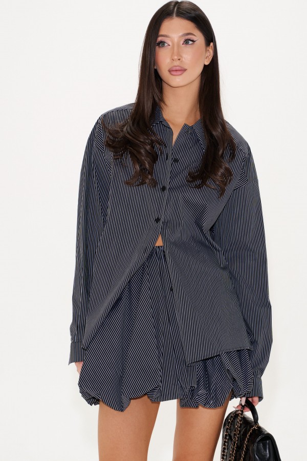 Юбка-баллон в длине мини. Выполнена из хлопкового полотна черного цвета в полоску. Пояс на резинке. Есть подкладка. Застёжки нет. Длина 41 см