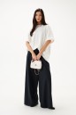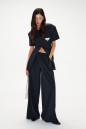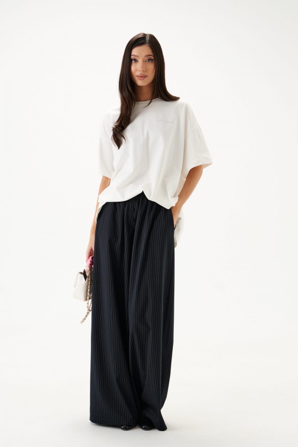 Брюки прямого кроя выполнены из текстильного полотна с принтом вертикальная полоска.