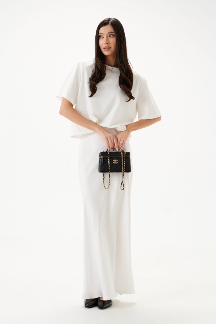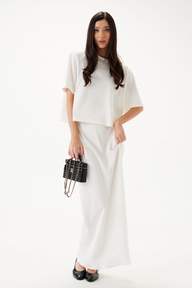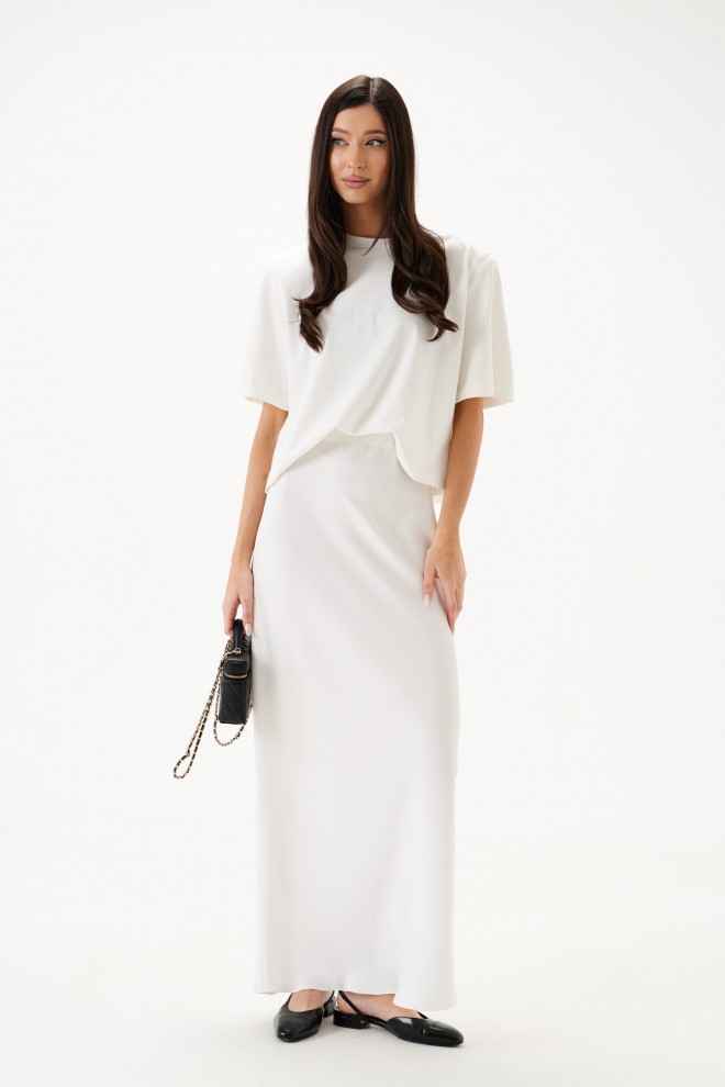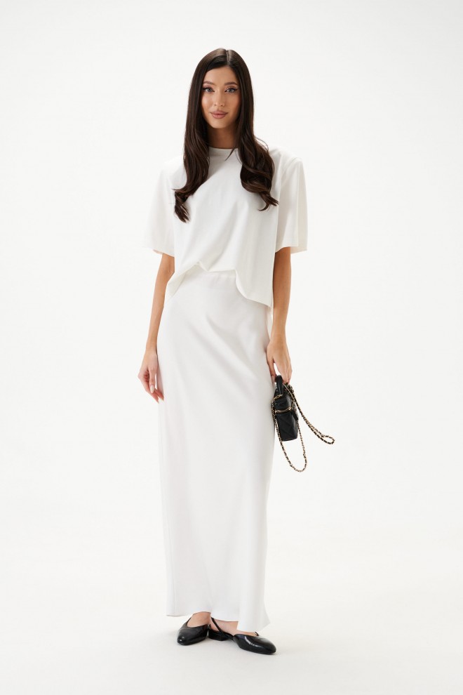 Юбка полуприлегающего силуэта выполнена из струящегося полотна белого цвета на подкладе. Характеристики: полуприлегающий силуэт, пояс на резинке, трикотажный подклад. Длина по боковому шву 109 см.