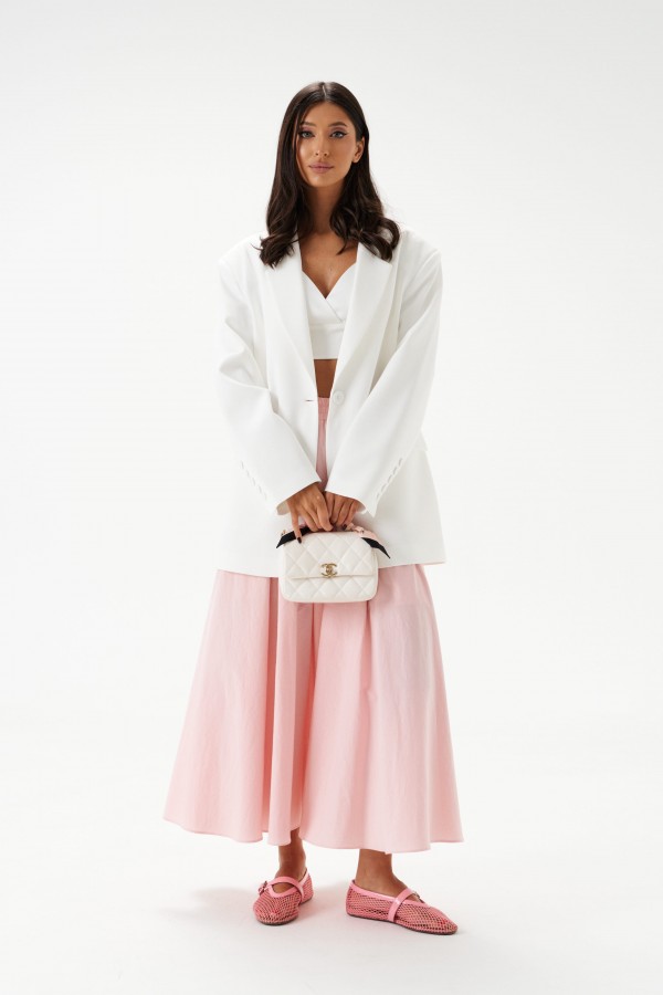 Юбка кроя полусолнце, выполнена из ткани нежно-розового цвета.