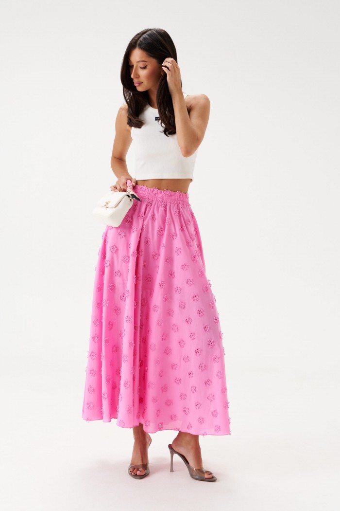 Юбка свободного кроя. Выполнена из хлопкового полотна розового цвета с перфорацией-узором с подкладкой-мини. Пояс на резинке. Застёжки нет. В боковых швах карманы. Длина юбки по боковому шву 96 см