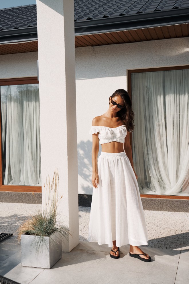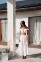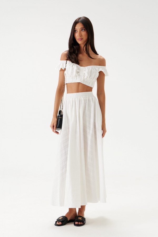Юбка кроя полусолнце, выполнена из ажурного полотна тепло-белого цвета.