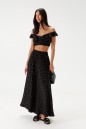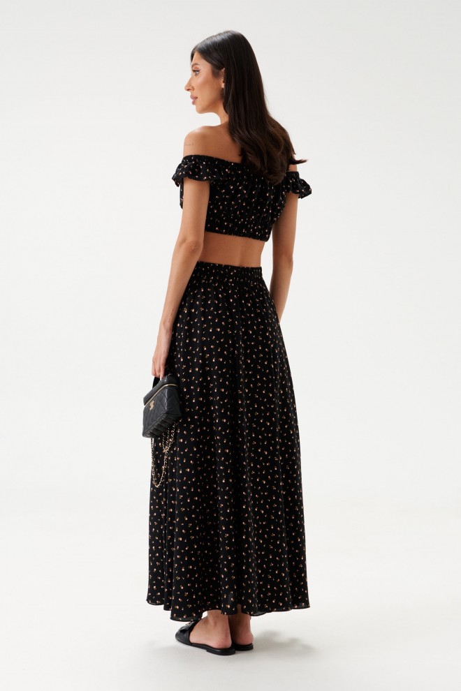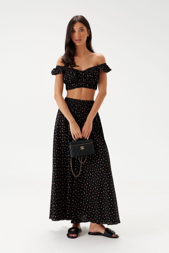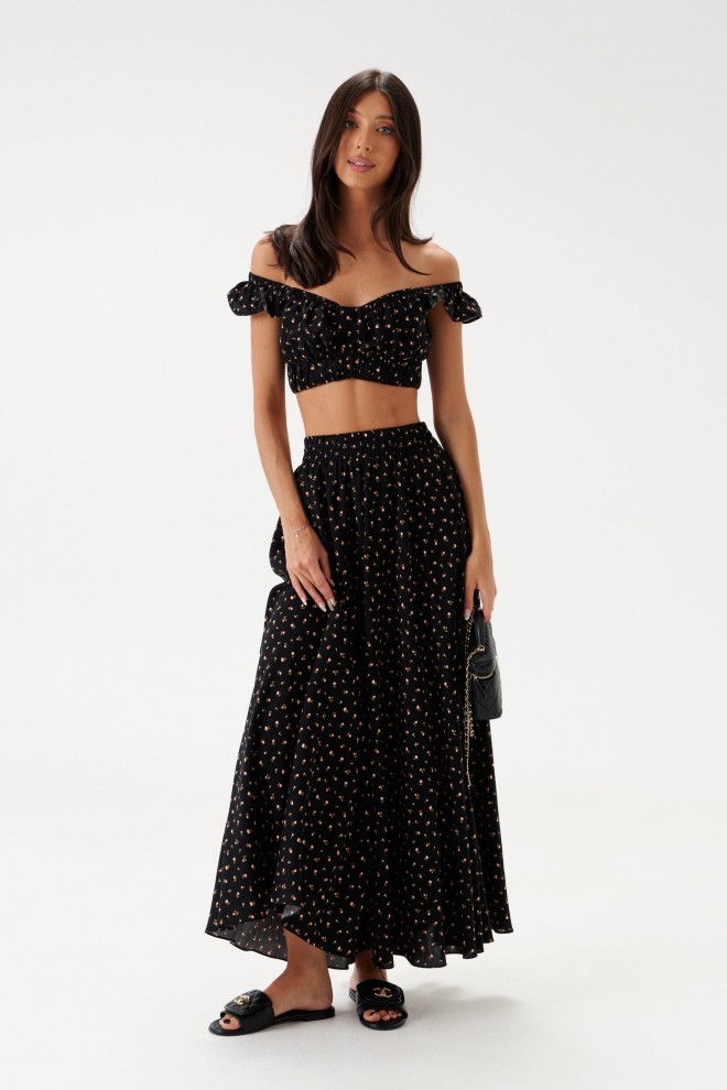 Юбка кроя полусолнце, выполнена из полотна черного цвета с цветочным принтом.