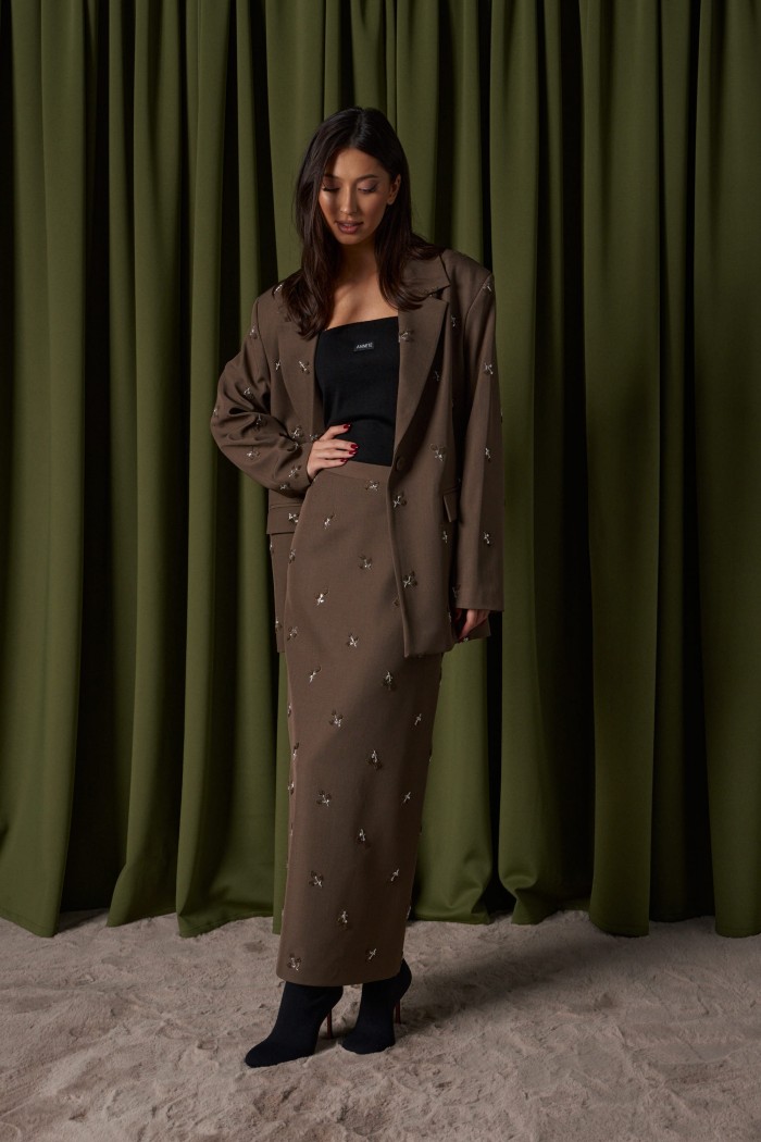 Юбка прямого кроя. Выполнена из костюмной ткани цвета хаки с декоративной вышивкой. На брендированной подкладке. Пояс стабильный. В среднем шве заднего полотна разрез (49 см). Застёжка молния в среднем шве заднего полотна. Длина юбки 96 см