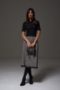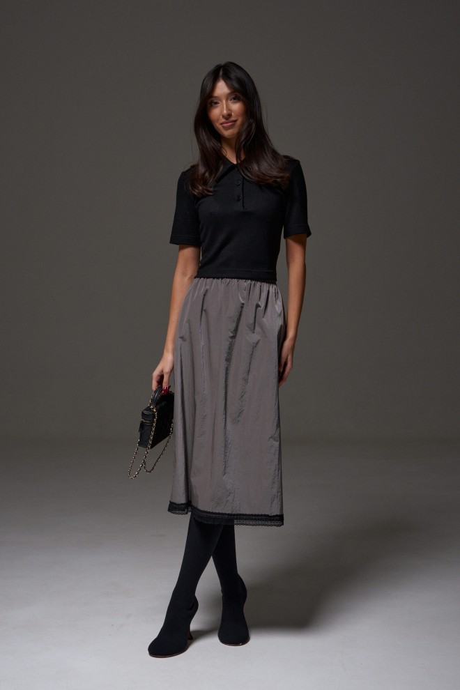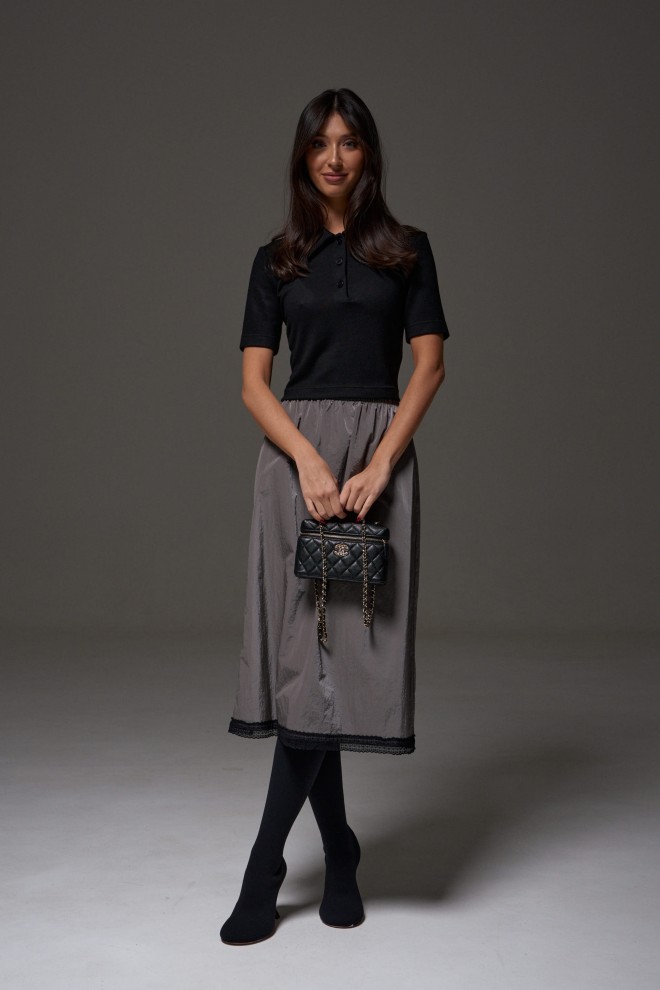 Юбка полуприлегающего силуэта выполнена из ткани плащевки на брендированной подкладе. Характеристики: полуприлегающий силуэт, пояс на резинке, по низу изделия пришито кружево. Длина по боковому шву 77 см.